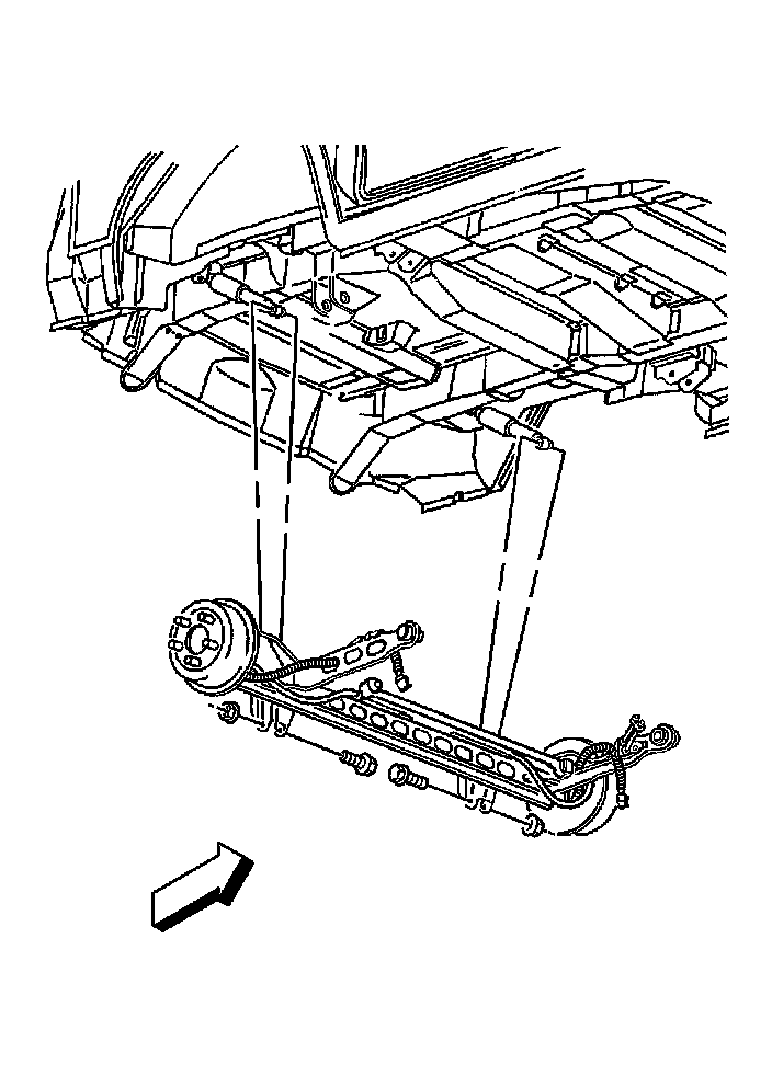When removing the rear springs, do not use a twin-post type hoist. The swing arch tendency of the rear axle assembly when certain fasteners are removed may cause it to slip from the hoist which may cause personal injury.