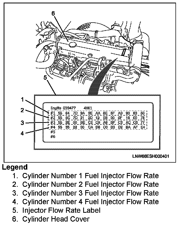- Fuel Injector ID plate located on the top of each fuel injector. (Preferred Method) The correct order for the fuel injector flow rates for the following illustration are as follows: