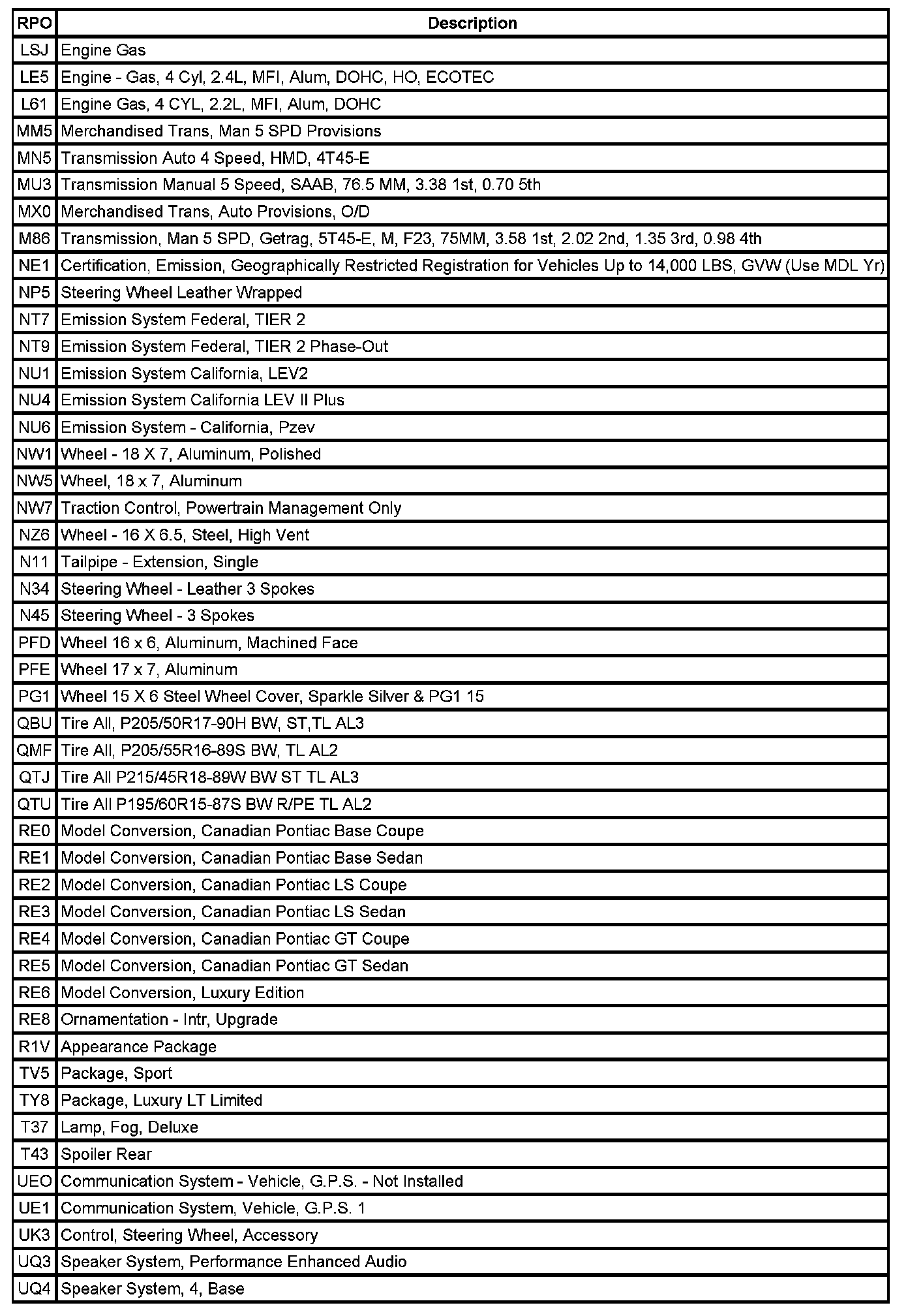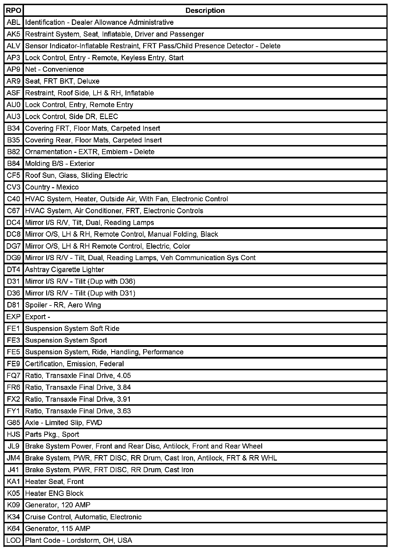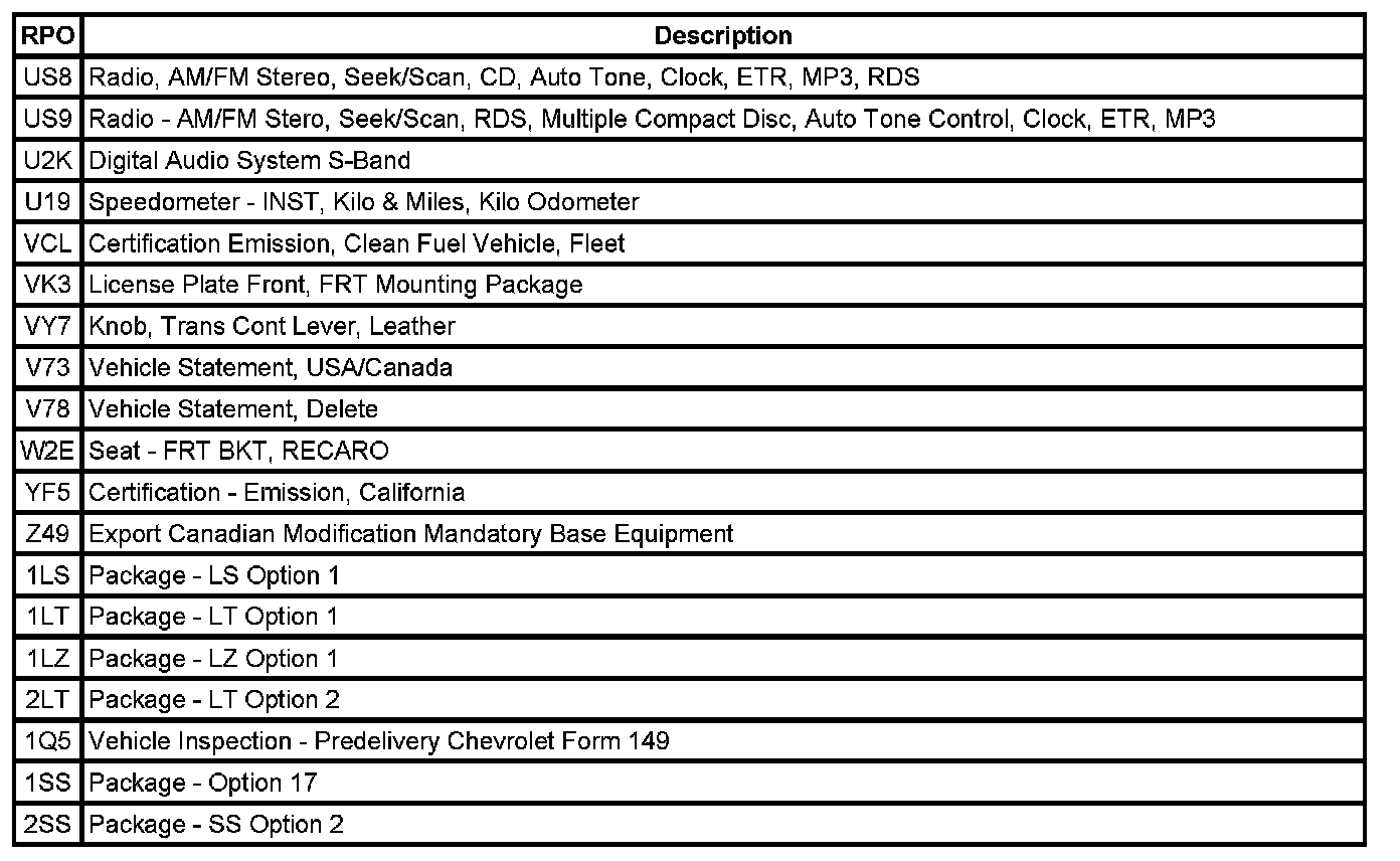 The following table provides the description of the Regular Production Option (RPO) codes that are available on the vehicle. The vehicle's RPO list is printed on the Service Parts Identification Label.