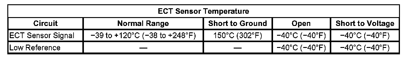 The ECM detects that the ECT is less than -39°C (-38°F) for greater than 5 seconds.
