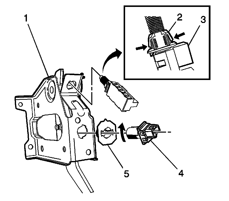 1. Slide only the clutch release switch retainer (5) into the clutch pedal bracket (1), until the locking tabs are fully engaged.