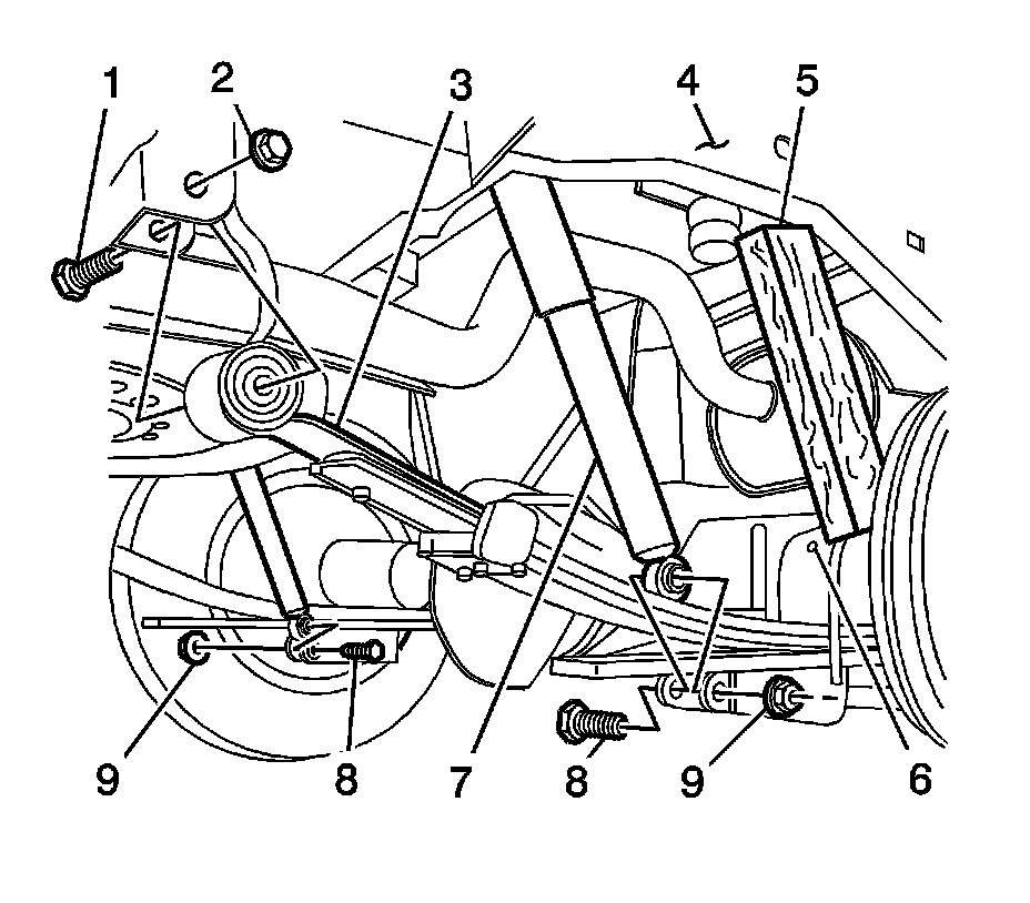 7. Install the lower shock absorber bolts (8) and nuts (9).