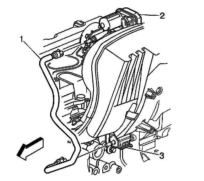 8. Connect the EVAP purge tube to the throttle body control module (2) and the EVAP canister purge solenoid valve (3).