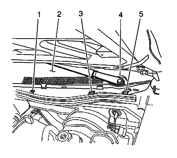 4. Remove the retainers (1, 3, 5) securing the air inlet panel grille (2) to the cowl panel.
