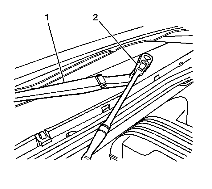 2. Lift the wiper blade off the windshield and install the wiper arm (1) to the wiper arm pivot shaft (2).