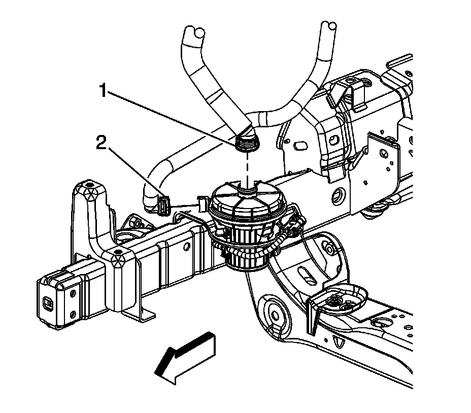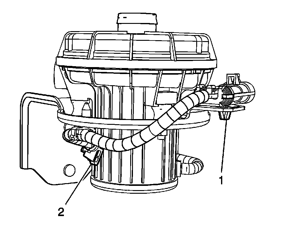 2. From under the hood, disconnect the secondary air injection (AIR) pump inlet hose quick connect fitting (1) from the pump. Refer to Plastic Collar Quick Connect Fitting Service.