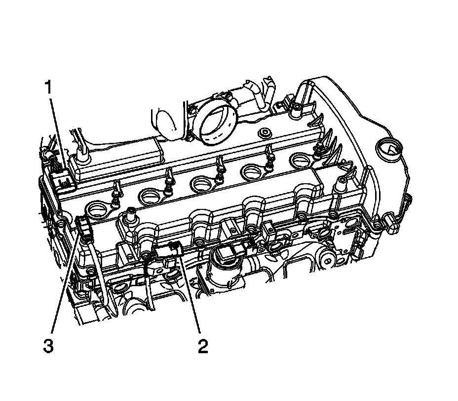 5. Disconnect the engine wiring harness retainer (2) from the camshaft cover (3).