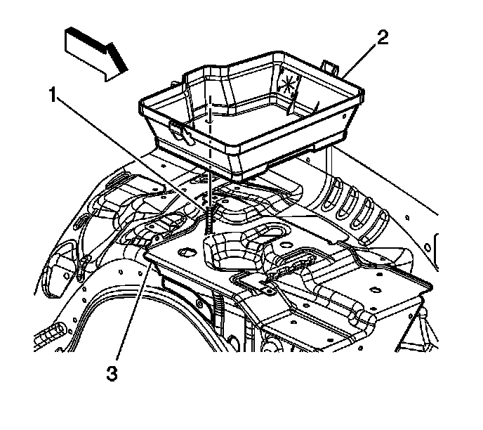 1. Install the lower battery box (2) to the retainer stud (1) and battery tray (3).