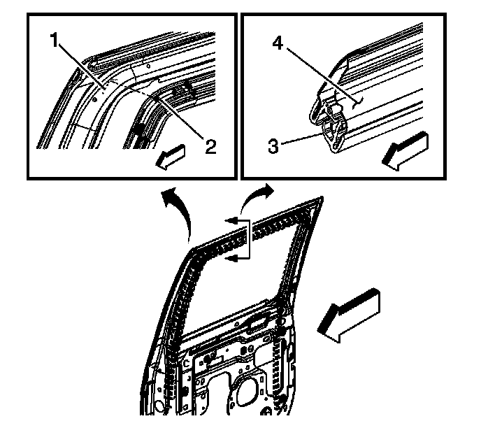 2. Firmly seat the window weatherstrip (3) into the rear door window channel (4).