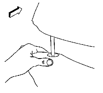 3. In order to release the head restraint retainer, simultaneously lift up on the head restraint while applying inward pressure to the tool in the retainer release port (1).