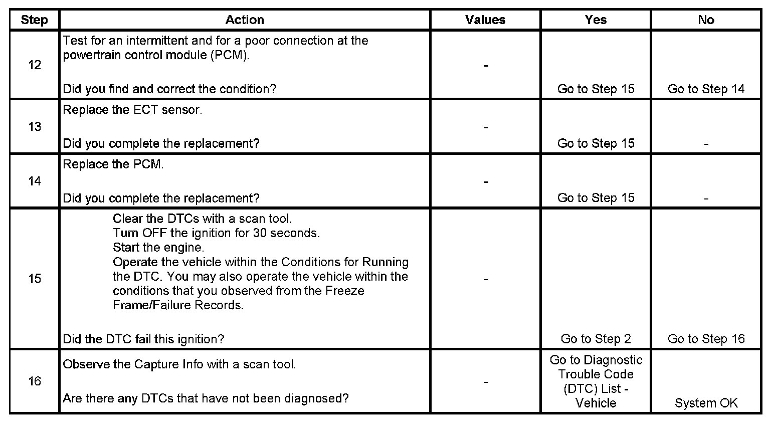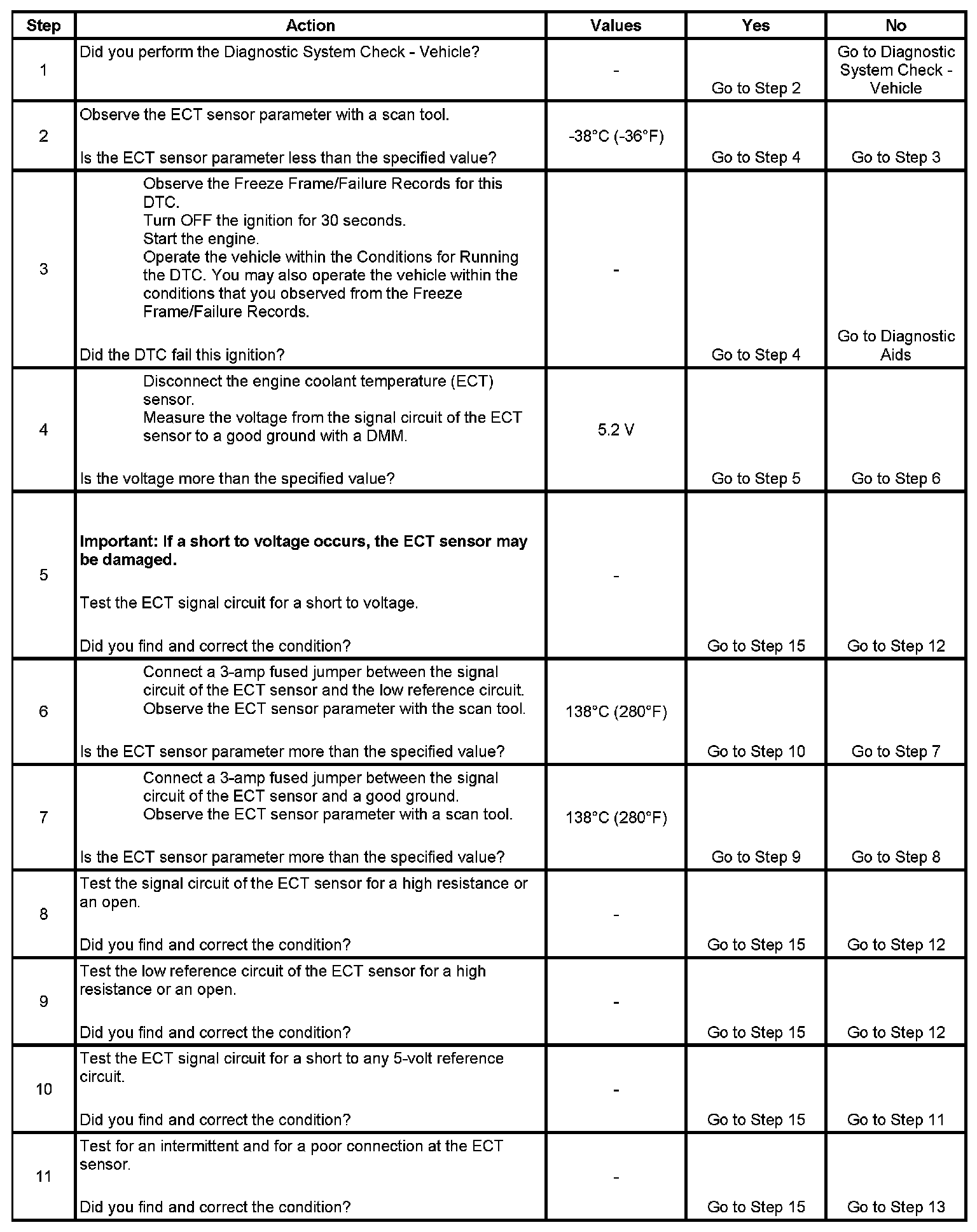 The engine coolant temperature (ECT) sensor is a variable resistor, that measures the temperature of the engine coolant. The ECT sensor has a signal circuit and a low reference circuit. The powertrain control module (PCM) supplies 5 volts to the ECT signal circuit and a ground for the ECT low reference circuit. When the ECT is cold, the sensor resistance is high. When the ECT increases, the sensor resistance decreases. With high sensor resistance, the PCM detects a high voltage on the ECT signal circuit. With lower sensor resistance, the PCM detects a lower voltage on the ECT signal circuit. If the PCM detects an excessively high ECT signal voltage, which is a low temperature indication, DTC P0118 sets.