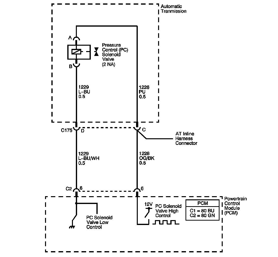 The pressure control (PC) solenoid valve is a powertrain control module (PCM) controlled device that regulates the transmission line pressure. The PCM compares throttle position (TP) sensor voltage, engine RPM, and other inputs in order to determine the appropriate line pressure for a given load. The PCM regulates line pressure by applying a varying duty cycle to the PC solenoid valve based on the resistance of the solenoid, and the amperage needed to obtain optimum line pressure. The applied amperage varies from 0.1 amps for maximum line pressure to 1.1 amps for minimum line pressure.