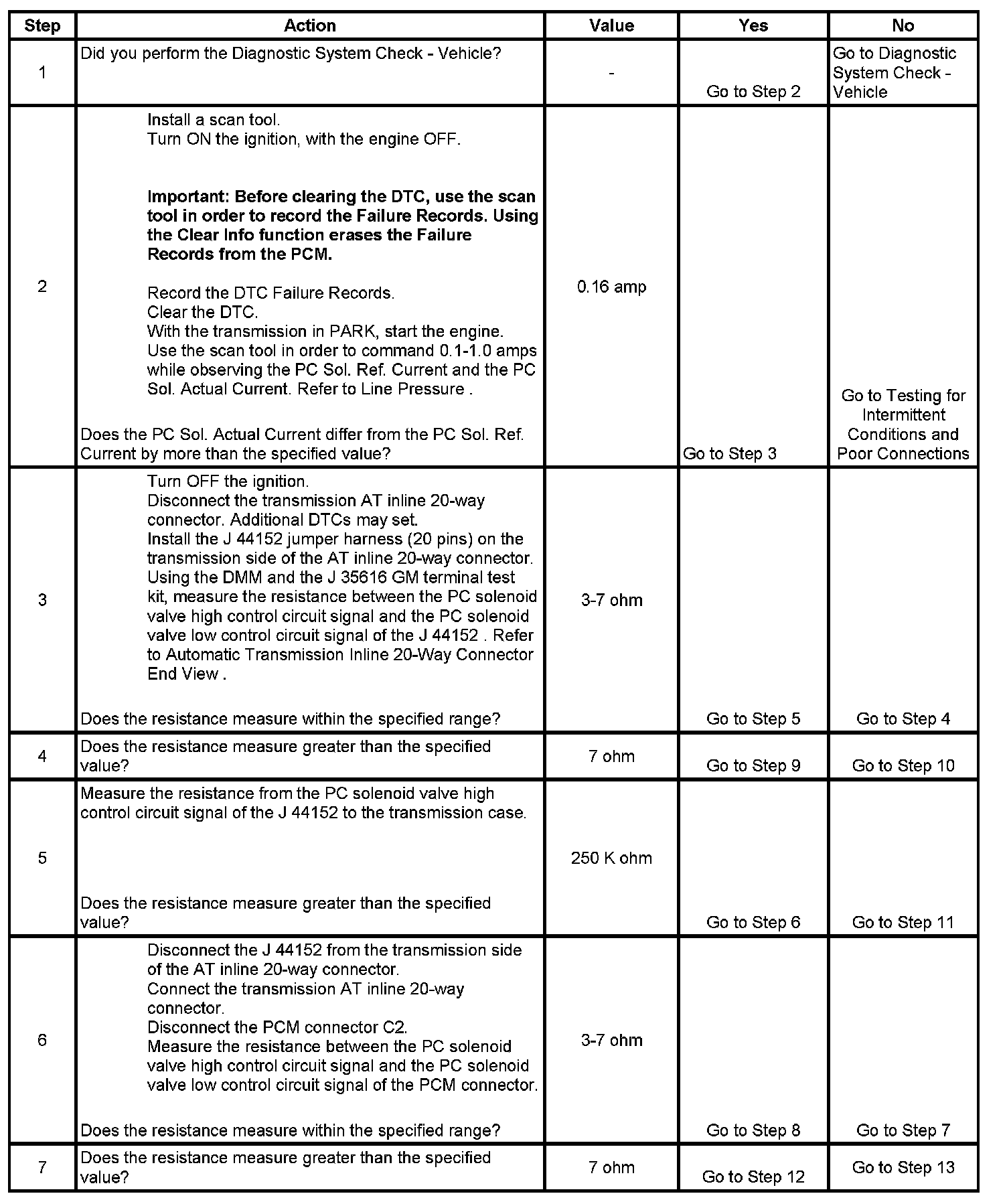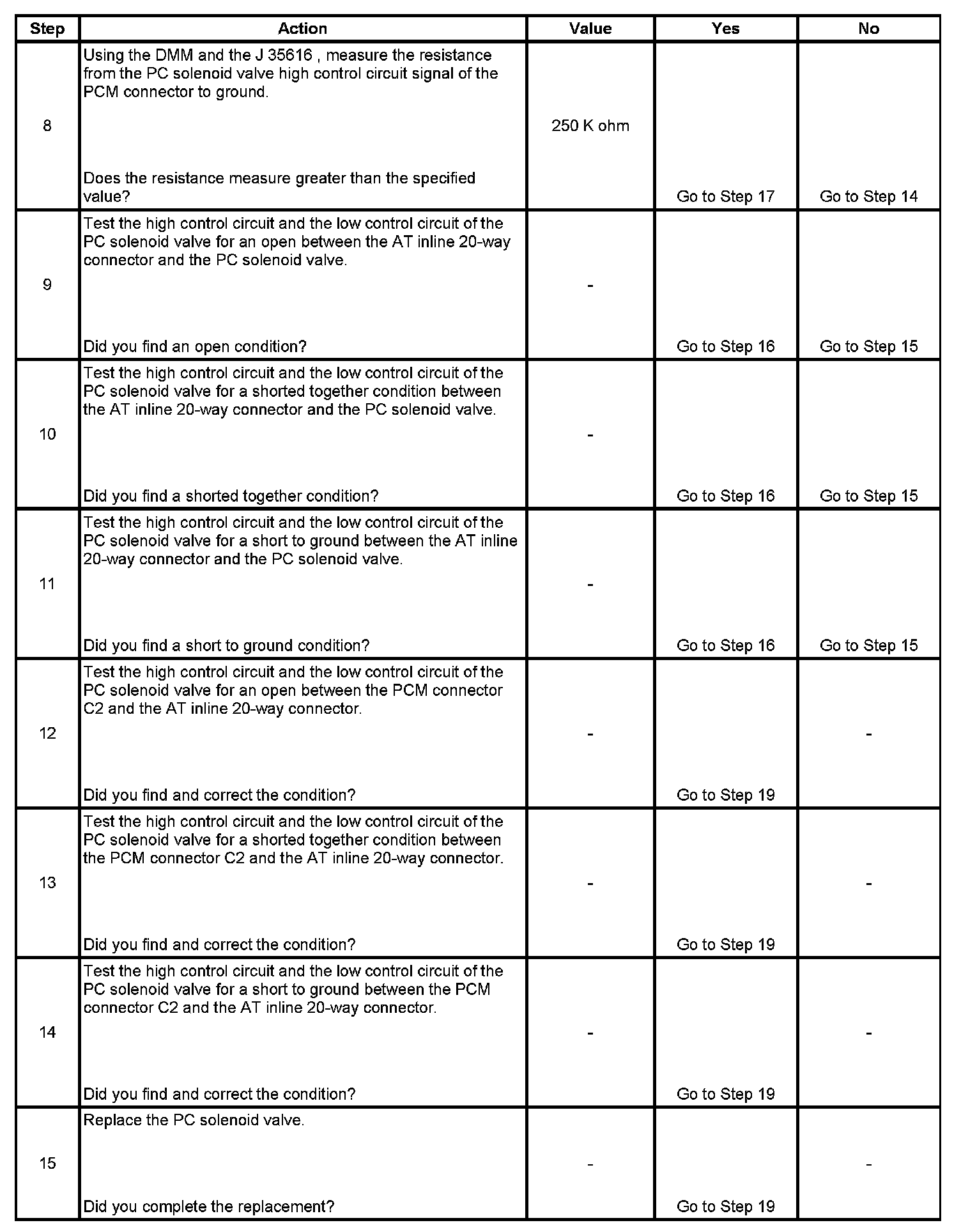 3. This step tests the PC solenoid valve and the automatic transmission (AT) wiring harness assembly for incorrect resistance.