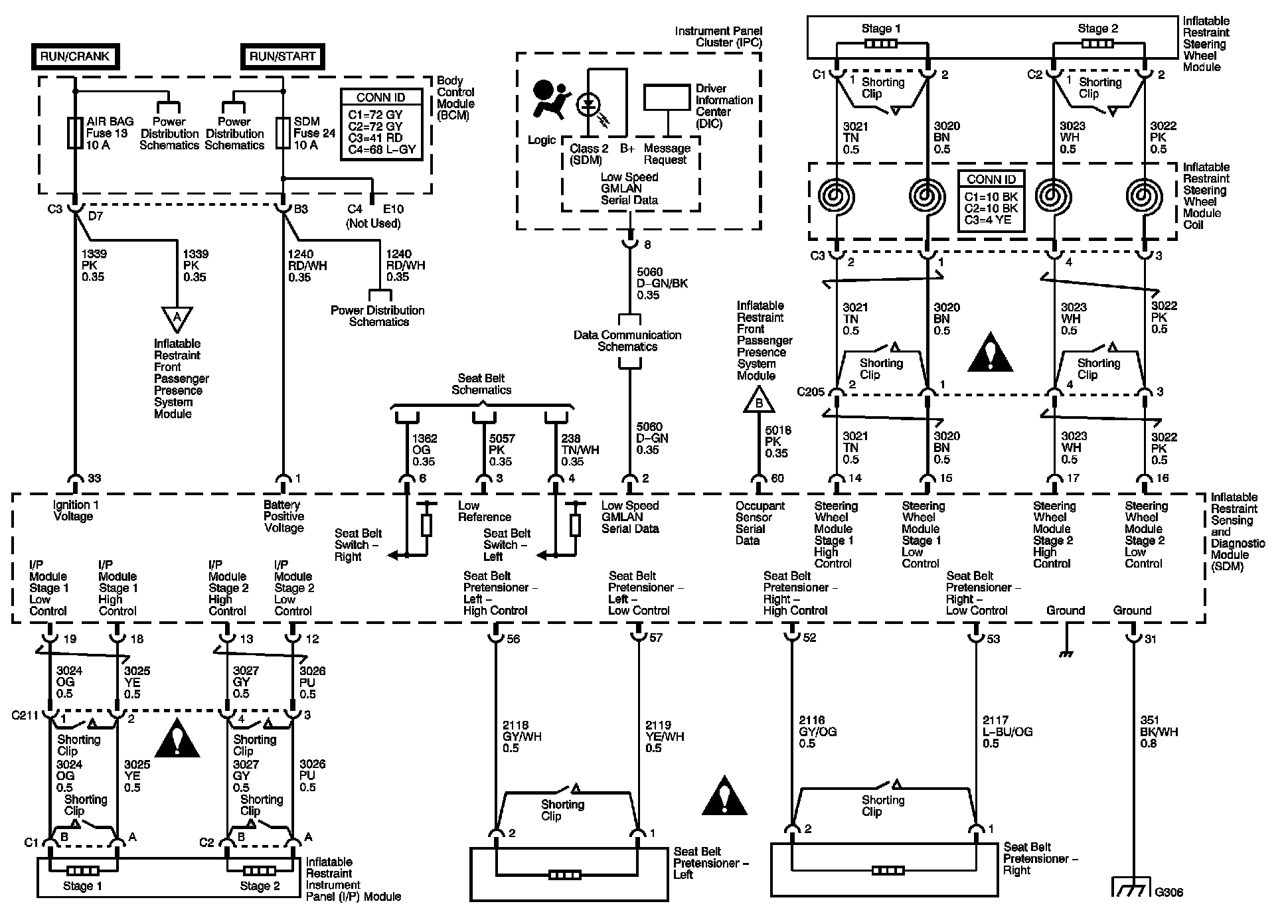 SIR Indicators, Power, Ground, Pretensioners, and Front Air Bag Modules