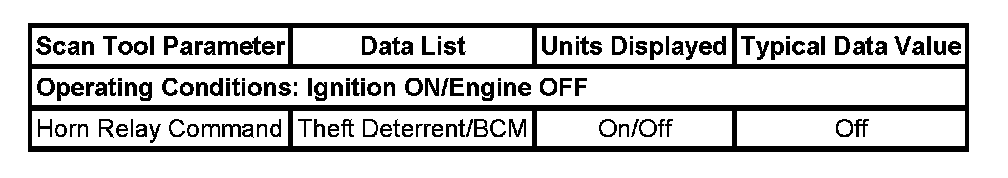 The Horns Scan Tool Data List contains all of the horn related parameters that are available on the scan tool. The parameters in the list are arranged in alphabetical order. The column, "Data List," indicates the location of the parameter within the scan tool menu selections. Use the Horns Scan Tool Data List as directed by a diagnostic table or in order to supplement the diagnostic procedures. Begin all of the diagnostic procedures with Diagnostic System Check - Vehicle.