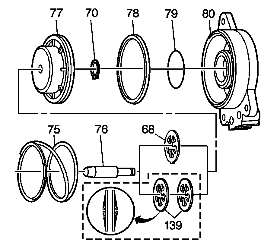 2. Install the snap ring (70) onto the servo pin (76) in order to retain the springs (68) and piston (77).