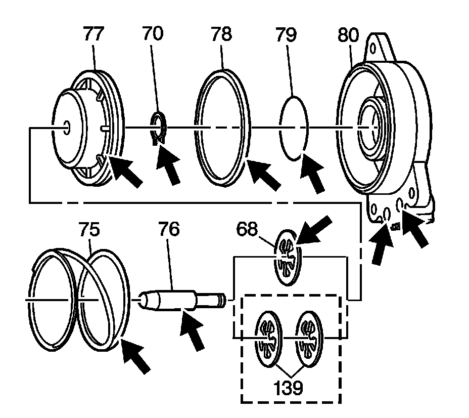 4. Install the servo piston assembly into the servo cover (80). Lubricate the piston seals with transmission fluid in order to aid in assembly.
