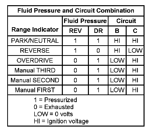 Each fluid pressure switch produces either an open or a ground to the PCM depending on the presence of fluid pressure at the switches. The sequence of open and closed switches produces a combination of voltage readings. The PCM monitors these readings.