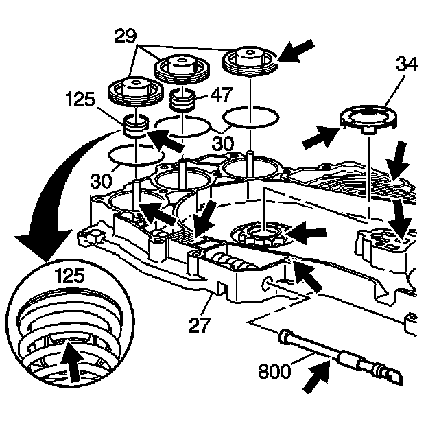 Important: The 1-2 accumulator assist spring (125) has a retainer that presses into the spring. Keep the retainer and the spring together as an assembly.