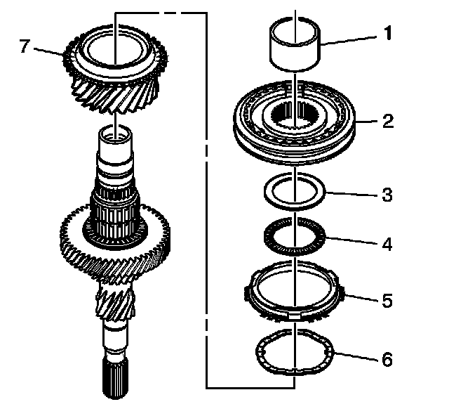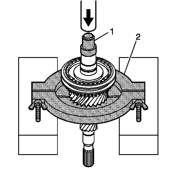 7. Remove the bearing collar and the 3rd/4th synchronizer from the input shaft using the J 36513 (2) under the 3rd speed gear, the J 44378 (1), and a hydraulic press.