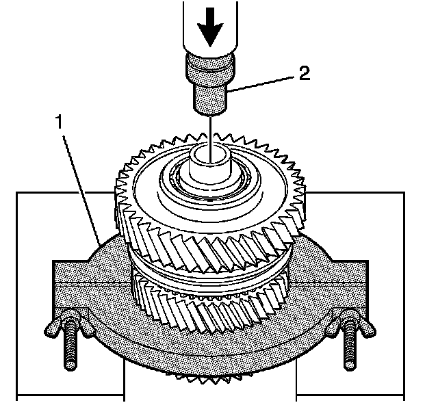 1. Press off the 1st gear assembly and the 2nd gear assembly as a unit, from the intermediate shaft using the J 36513 (1), the J 44383 (2) and a hydraulic press.