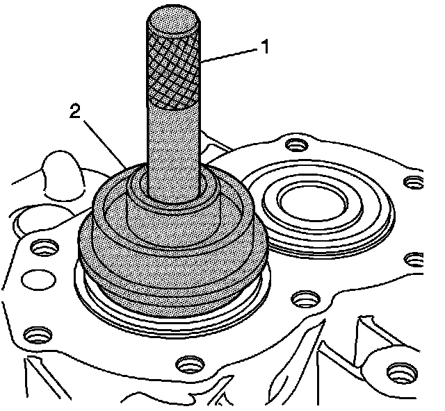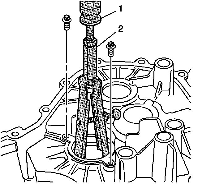 46. Remove the differential bearing outer race from the transmission housing using the J 44380 (2) and the J 23907 (1). Discard the race.
