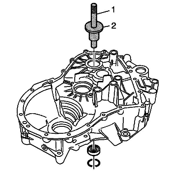 40. Using the J 44380 (2) and the J 23907 (1), remove the differential bearing outer race from the clutch housing. Discard the race.