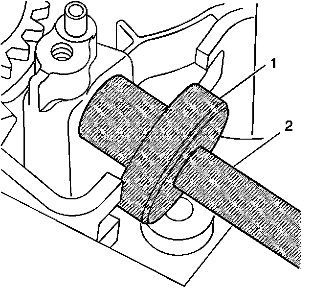 50. Remove the intermediate shaft needle bearing from the transmission housing using the J 44382 (2) and the J 23907 (1).