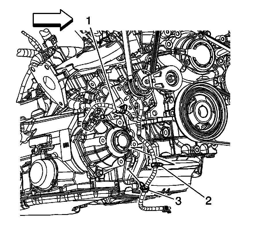 18. Remove the engine wiring harness clips (1, 2, 3) from the transaxle bracket.