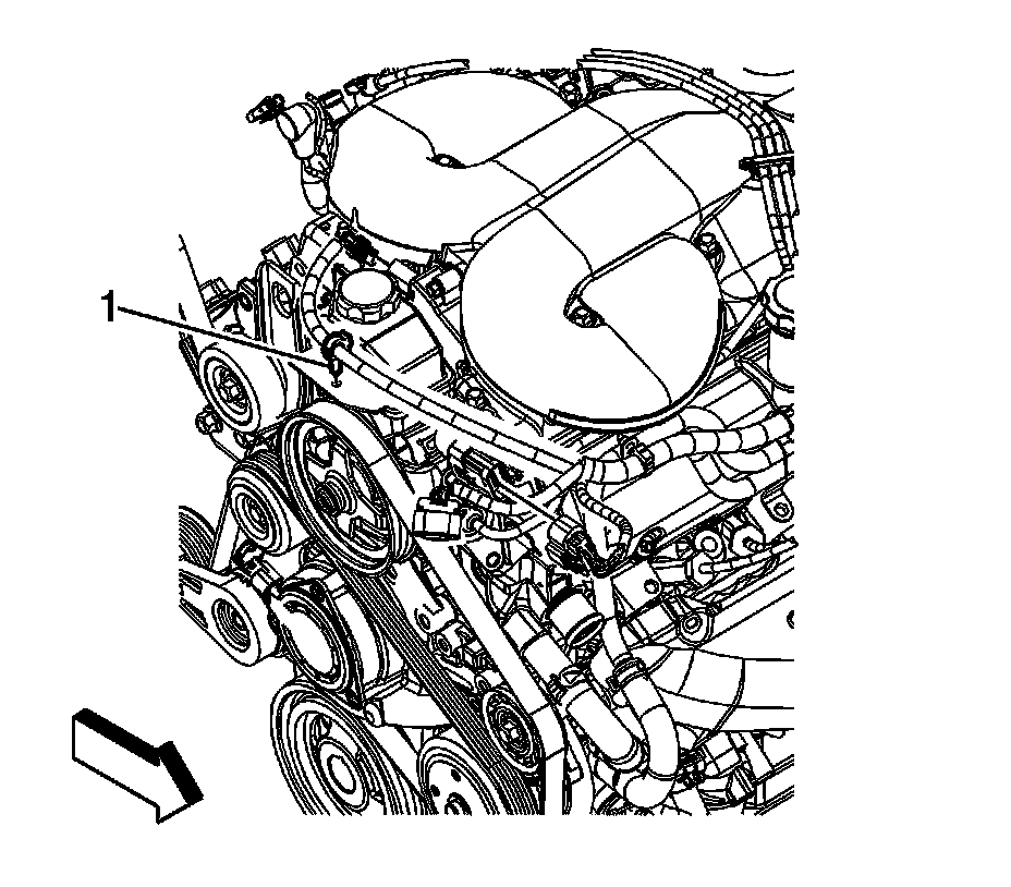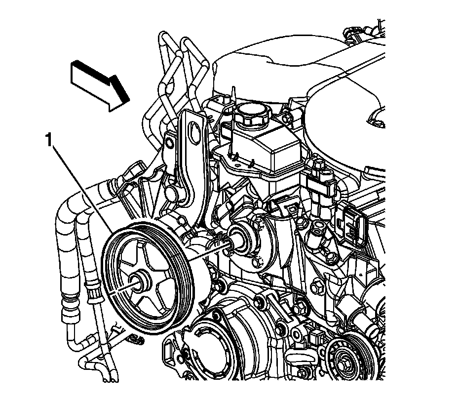 30. Remove the engine wiring harness clip (1) from the power steer pump bracket.