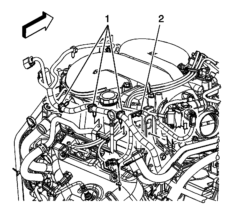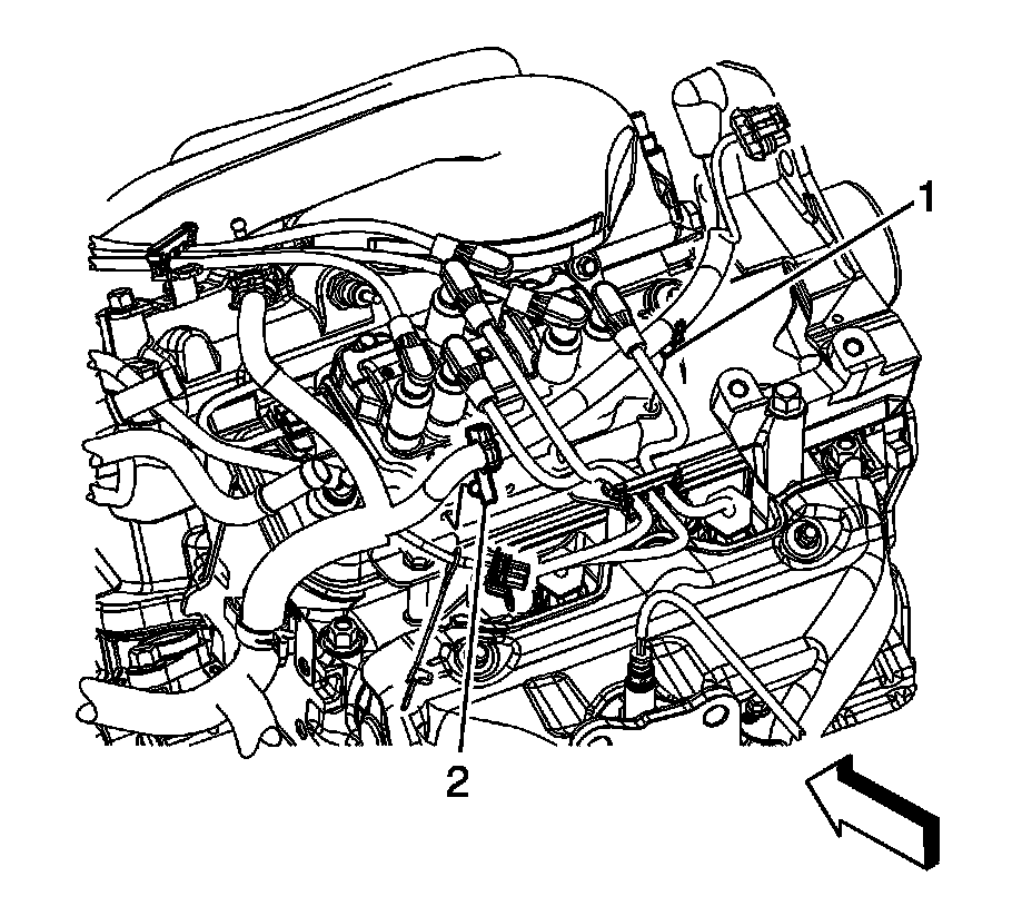 46. Remove the engine wiring harness clips (1, 2) from the ignition control module bracket.
