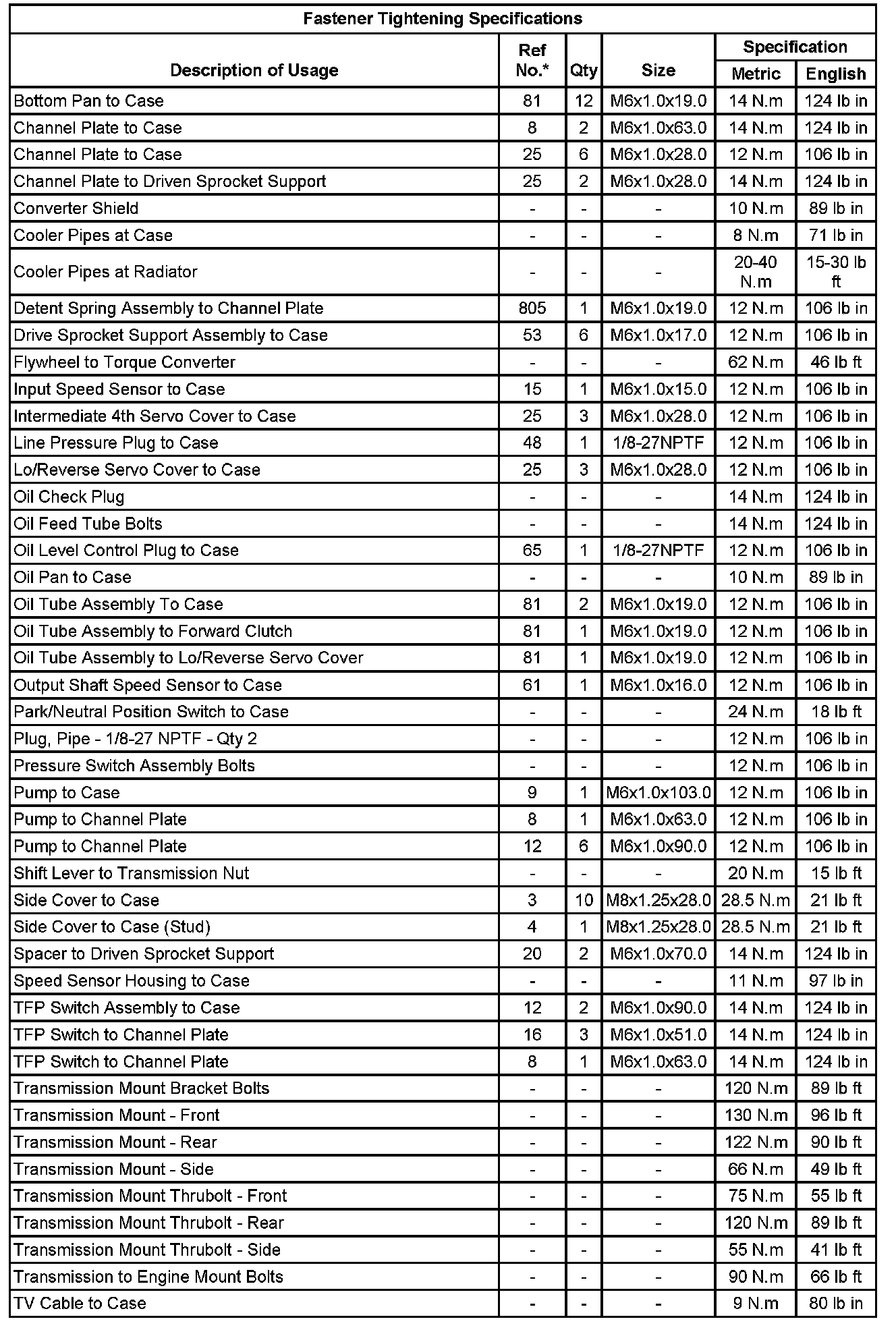 Fastener Tightening Specifications:
