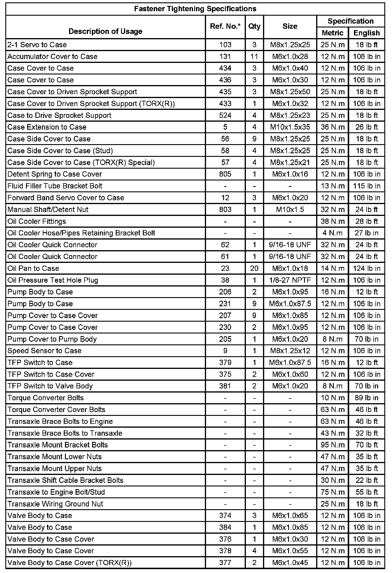 Fastener Tightening Specifications:
