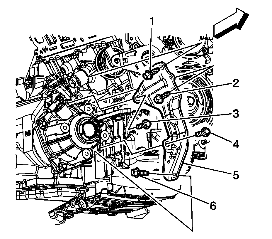 Install the transaxle brace to oil pan lower bolt (6), if equipped with RPO M15.