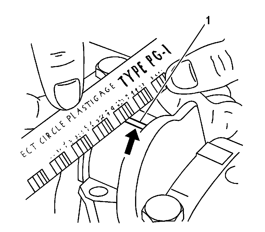 21. Measure the width of the flattened plastic thread (1) of the plastic gaging using the scale printed on the plastic gaging package. Plastic gaging is available for different tolerance ranges.