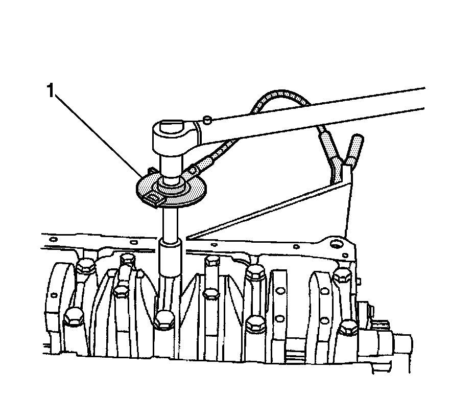 Tighten the crankshaft bearing cap bolts to 50 Nm (37 lb ft). Using the J 45059 or the KM-470-B (1), tighten the bolt an additional turn of 45 degrees plus 15 degrees.