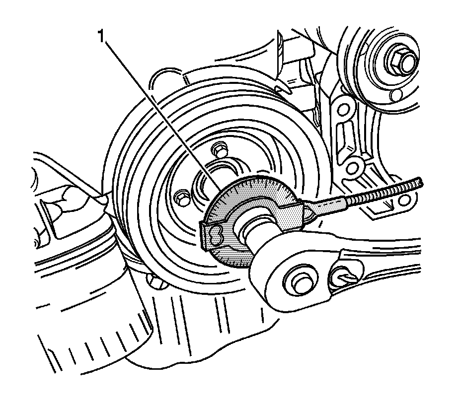 Tighten the crankshaft timing belt drive gear bolt to 145 Nm (107 lb ft) plus 30 degrees plus 15 degrees using the J 45059 or theKM-470-B (1).