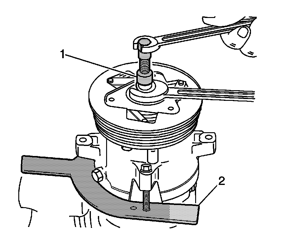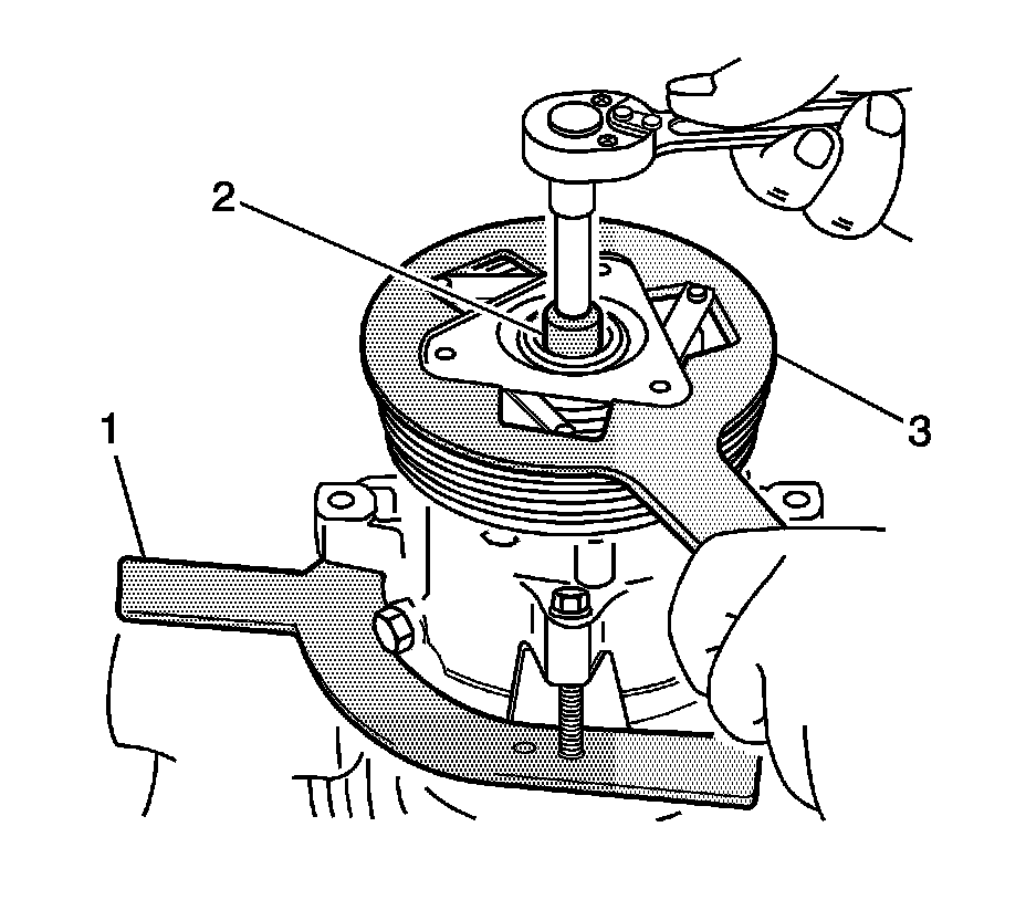 9. Install the shaft nut. Hold the clutch drive plate and the hub assembly with the J 33027-A (3). Use the J 33022 (2) and tighten the nut against the compressor shaft shoulder.