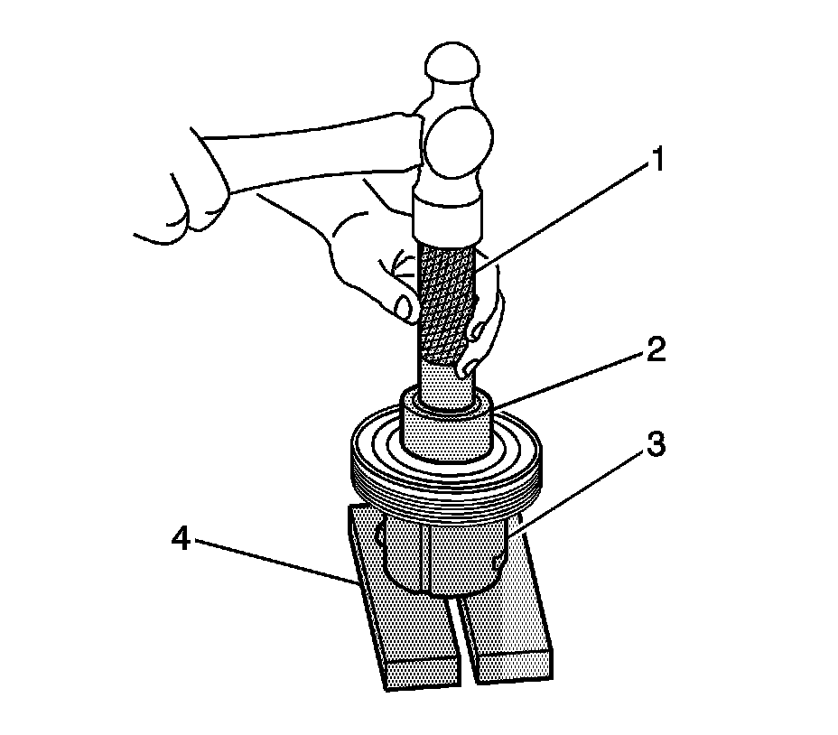 6. Position the J 33017 (4) and the J 33023-A (2) directly over the inner race of the bearing.