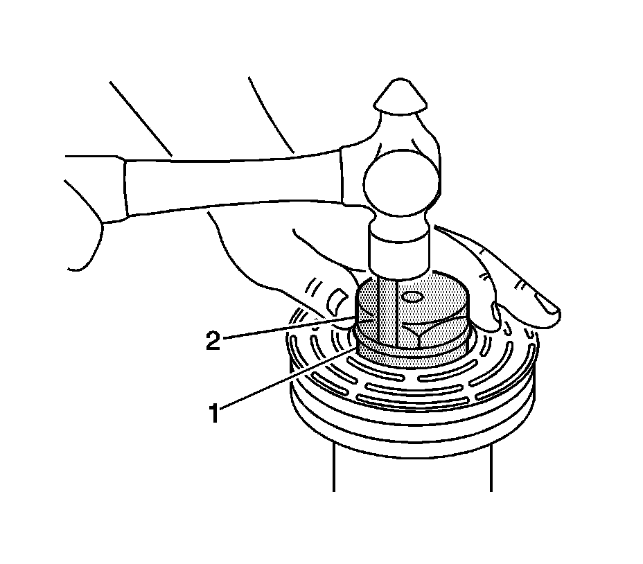 3. Place the J 33019 (1, 2) in the rotor hub core. Shift the rotor and bearing assembly on the block to give full support to the hub under the staking pin. A heavy-duty rubber band may be used to hold the staking tool pin in the guide. The pin should be properly positioned in the guide after each impact on the pin.