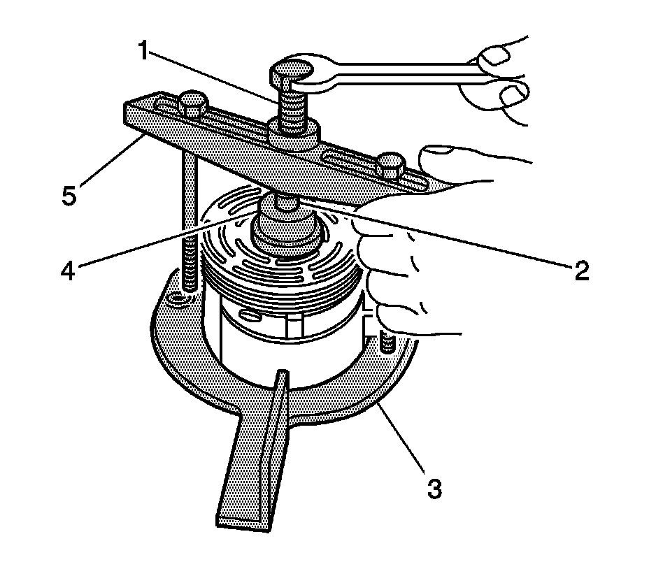8. Tighten the J 8433-3 (1) in the J 8433-1 (5) to force the pulley rotor and bearing assembly onto the compressor housing.