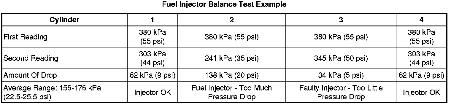 • If the difference between any individual pressure drop and the average pressure drop is more than 20 kPa (3 psi), replace the fuel injector.