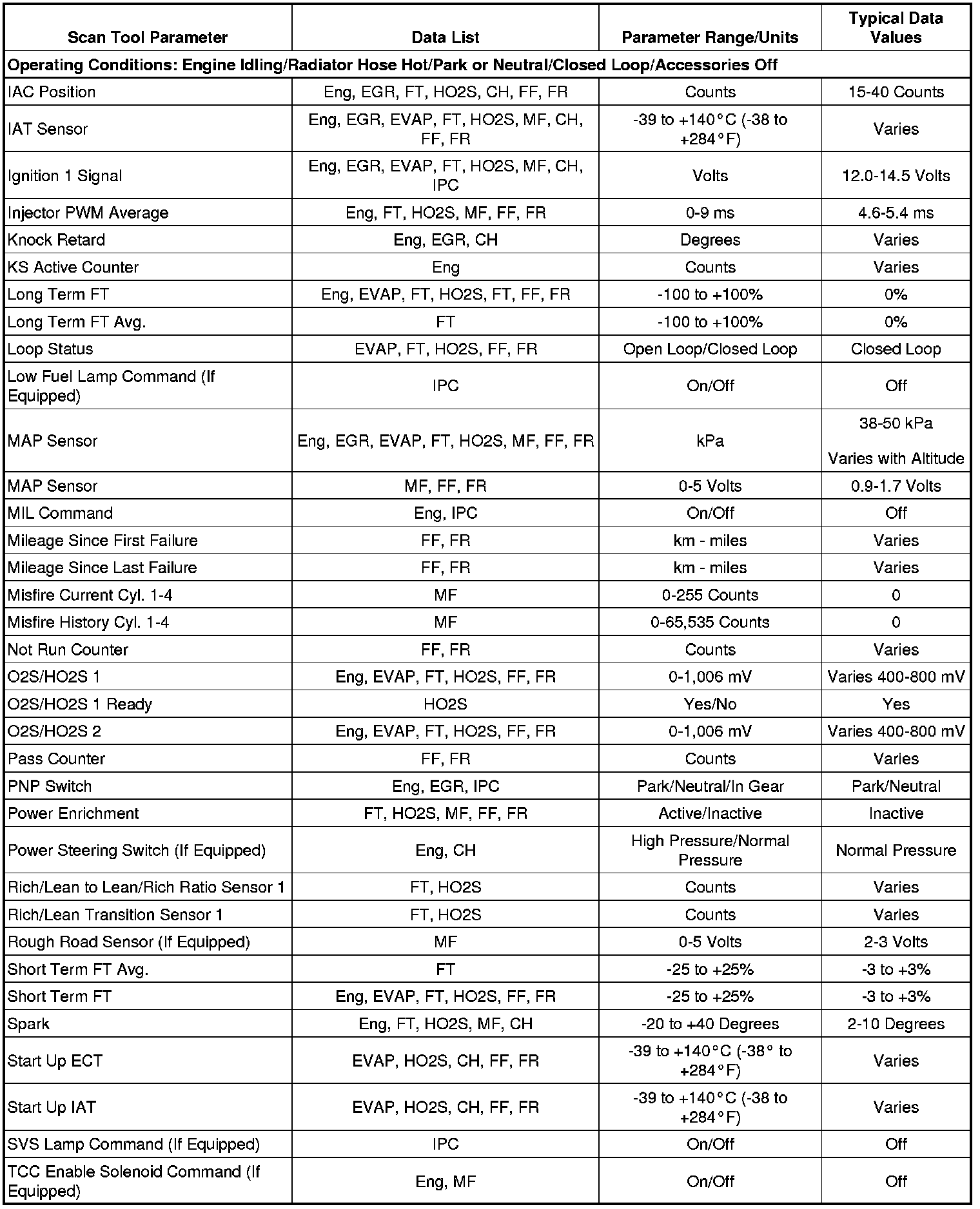Scan tool values from an engine that is operating correctly may be used for comparison with the engine you are diagnosing. The Engine Scan Tool Data List represents the values that would be seen on a normal operating engine.