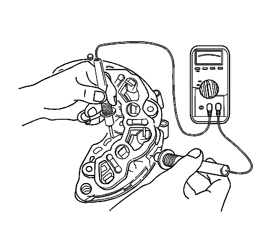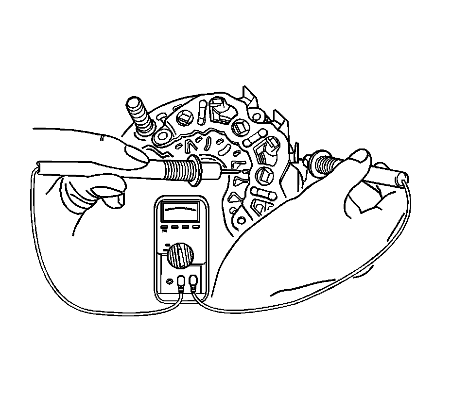 8. Test the rectifier bridge by connecting the ohmmeter terminals to the bridge and the heat sink.