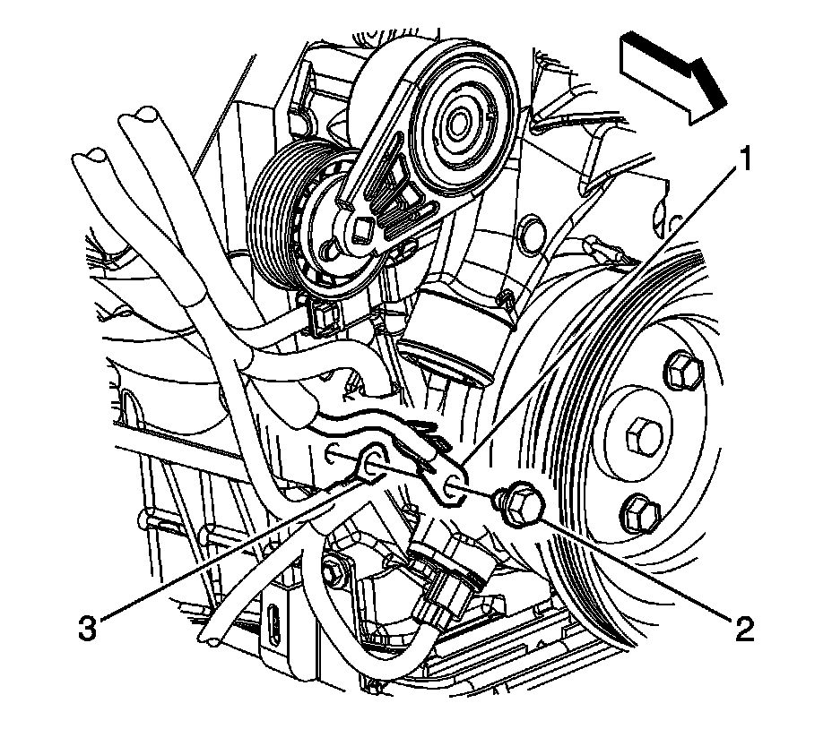 7. Remove the negative battery cable bolt (2) from the front of the engine block.