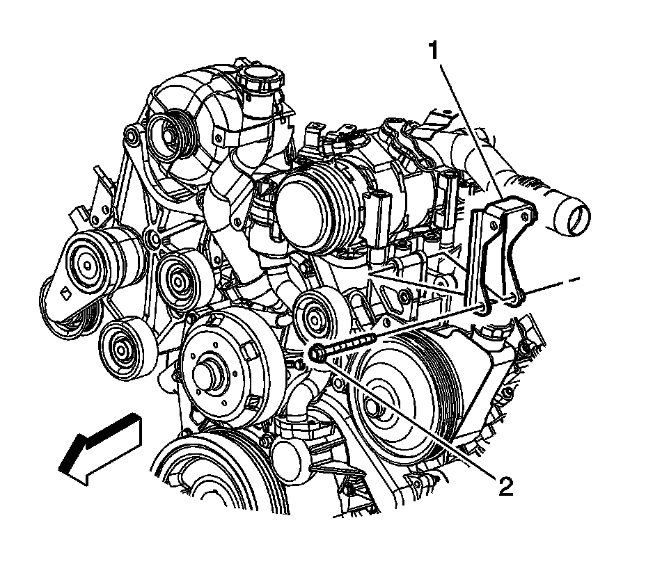 1. Position the auxiliary generator bracket (2) to the air conditioning (A/C) bracket.
