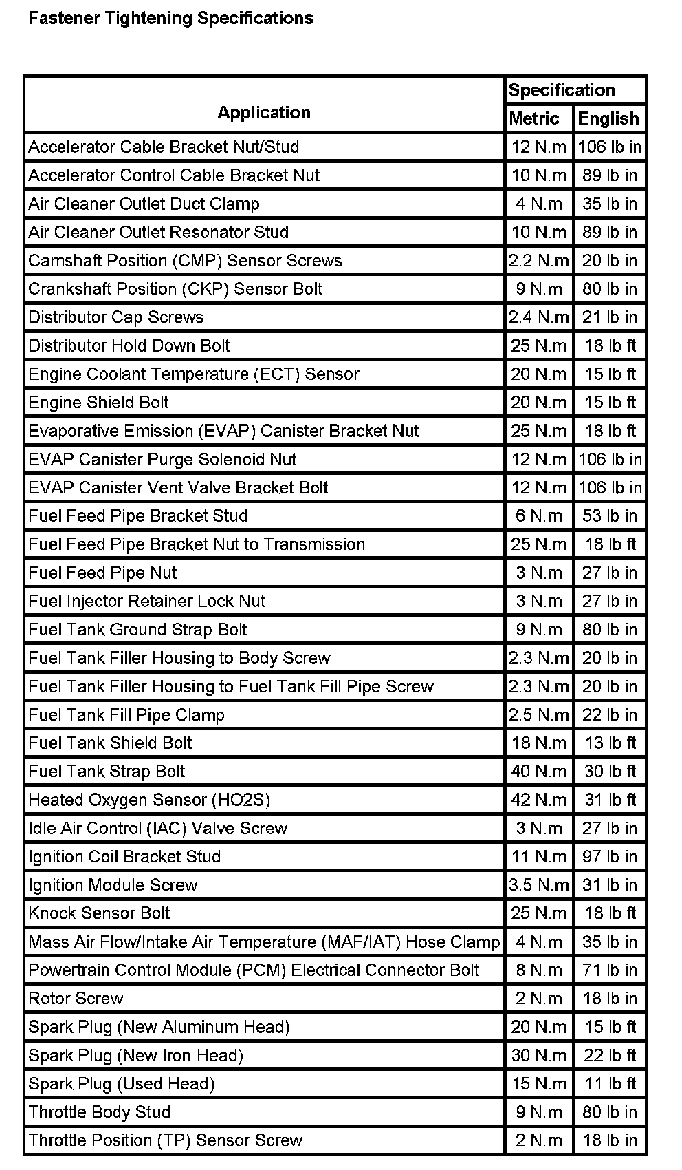 Fastener Tightening Specifications: