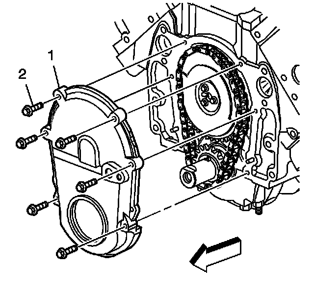 2. Lift the front cover (1) while sliding the cover over the crankshaft (2).
