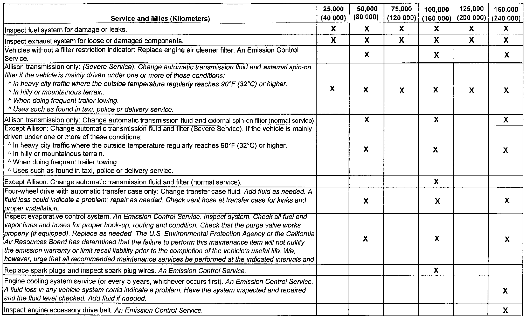 service (I or II) after the indicated miles (kilometers) shown for each item.