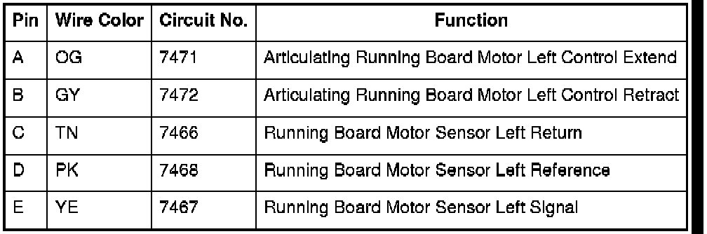 Table2: Assist Step Control Module C1 Assist Step Control Module C1 Table4: Assist Step Control Module C2 Table6: I/P Multifunction Switch Assembly (X88/Z88) Table8: I/P Multifunction Switch Assembly (Z75) Table10: Running Board - Left Table12: Running Board - Right